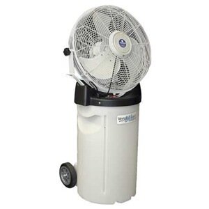 This outdoor misting fan has a built-in pump that produces up to 2 gallons of fine mist per hour. The 14 Gallon tank can last up to approximately 7 hours of continuous use. It can cool external air temperatures up to 30 degrees and will cover an area of about 200 square feet.