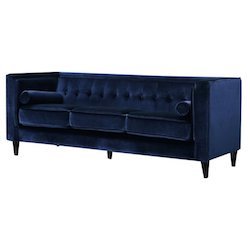 Navy tufted velvet sofa with clean lines and an elegant shape.