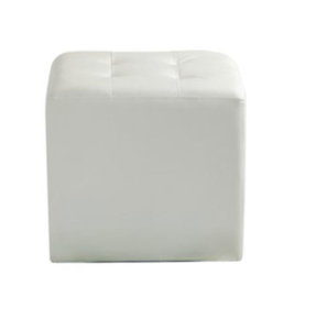 Small, white tufted leather ottoman. Dimensions: 16" x 16" x 16"